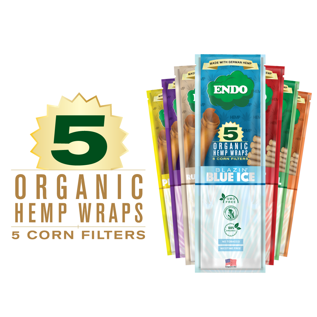 Our Endo Hemp Wraps are produced from organic hemp. Each stay-fresh, resealable pouch contains 5 tobacco free wraps. 5 corn husk filters are included for an enhanced smoking experience.