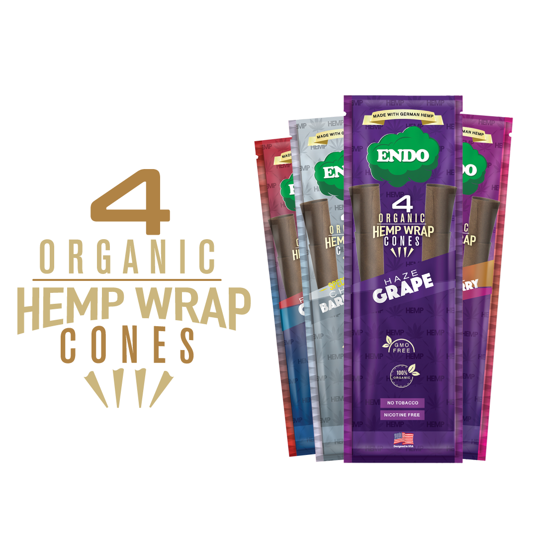 Our Endo Hemp Wrap Cones are produced from organic hemp. Each stay-fresh, resealable pouch contains 4 tobacco free cones.